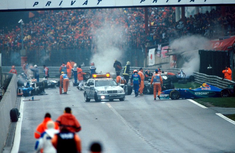 Дождевая гонка в Спа-Франкоршам началась с возможно самой массовой аварии в истории Ф1, в которой пострадали 13 машин. Лидерство при повторном старте захватил пилот Jordan Дэймон Хилл, но на восьмом круге его опередил Михаэль Шумахер на Ferrari.